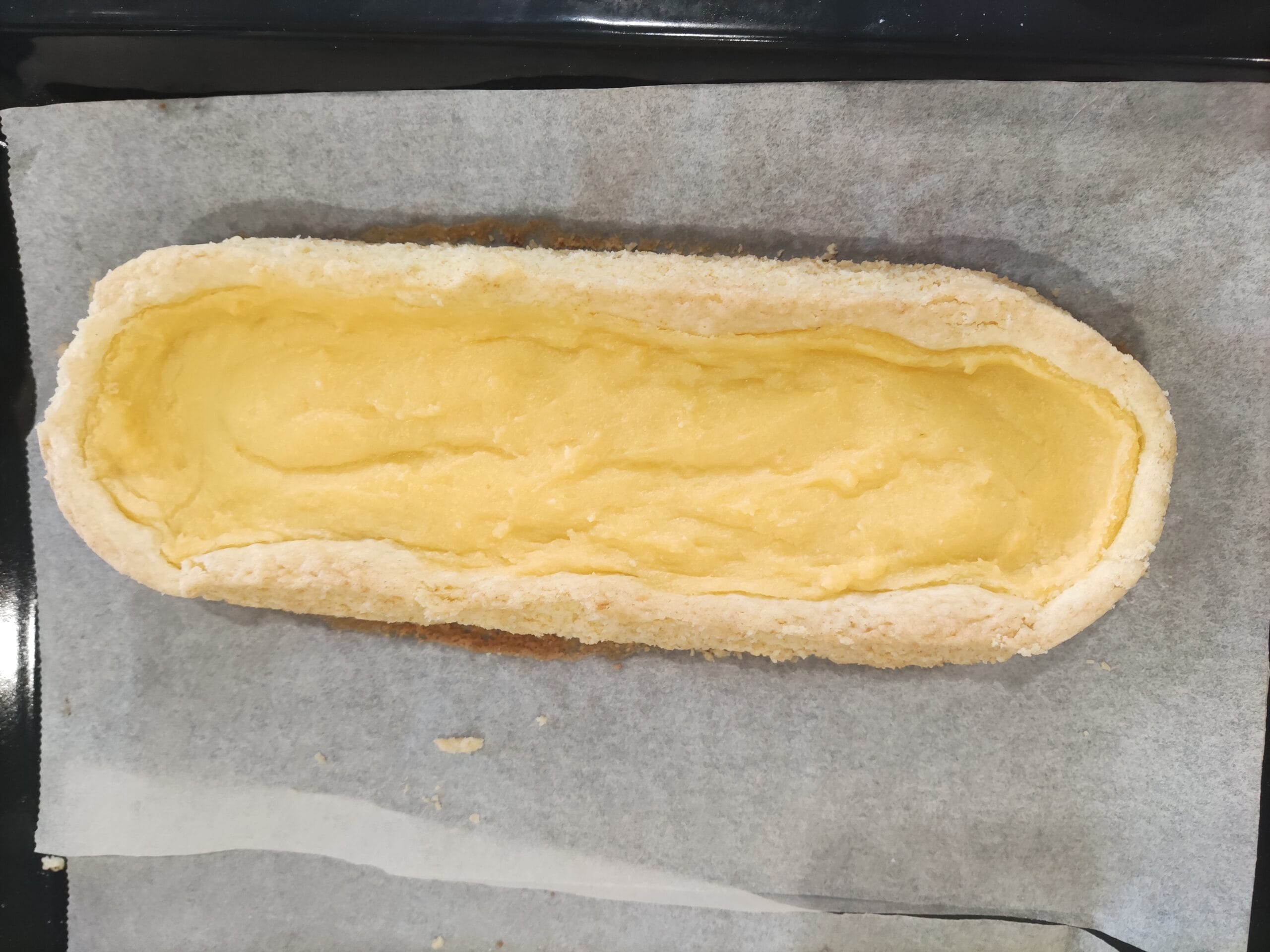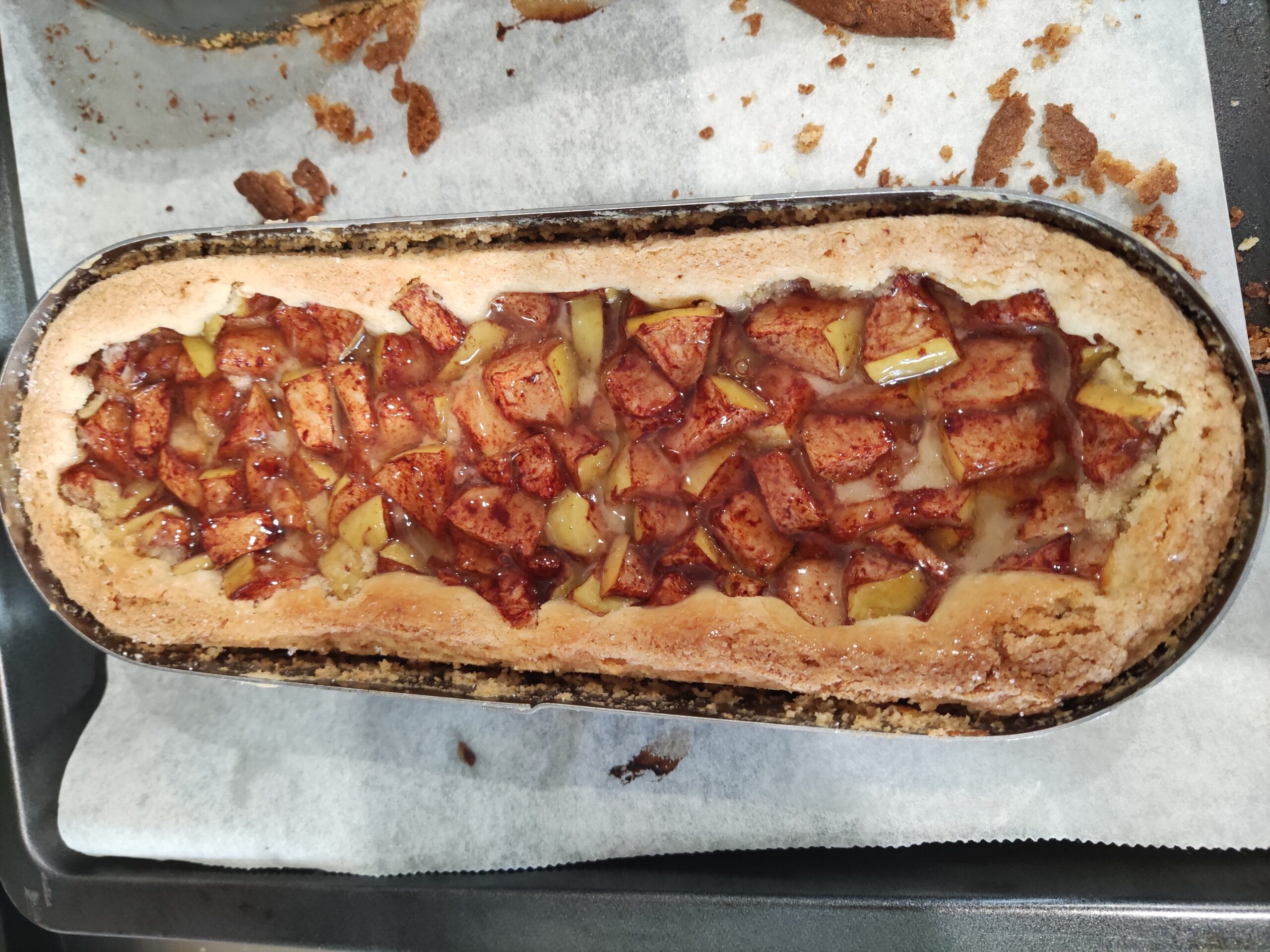 Huisgemaakte slof, gebakken met banketbakkersroom en amandelspijs. Belegd met een mengsel van verse appel, kaneel en rozijnen.
