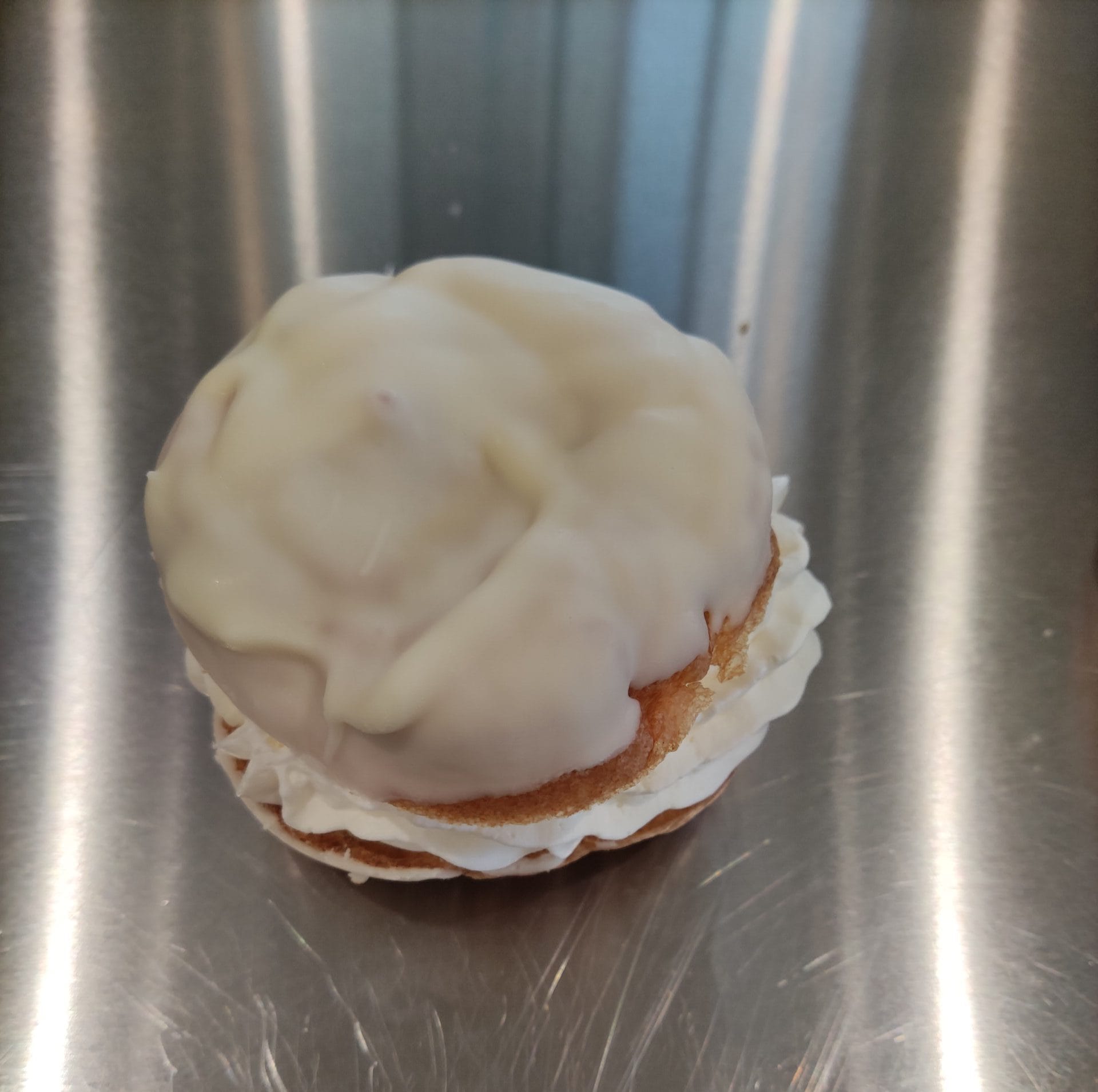 Glutenvrije soes, overgoten met coating en gevuld met banketbakkersroom, fruitvulling en slagroom.